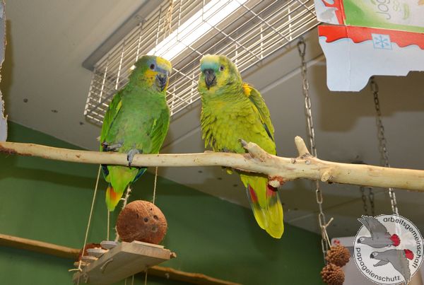 Blaustirn-Amazone HANNI und Venezuela-Amazone LAURA schauen am liebsten gemeinsam zu, was sich untertags am Gang im Papageienheim abspielt. Dies wird dann mitunter lautstark von den beiden kommentiert.